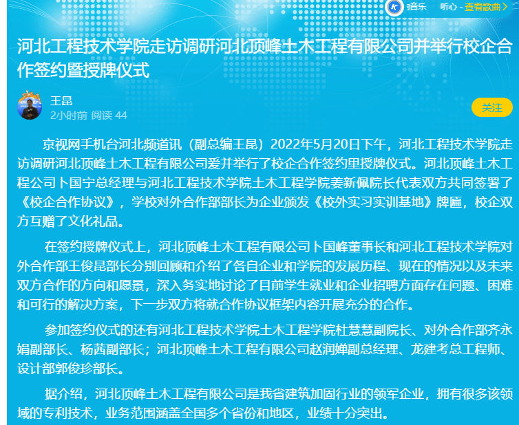 河北《少妇白洁》色情小说走访调研调研河北顶峰土木工程有限公司并举行校企合作签约暨授牌仪式