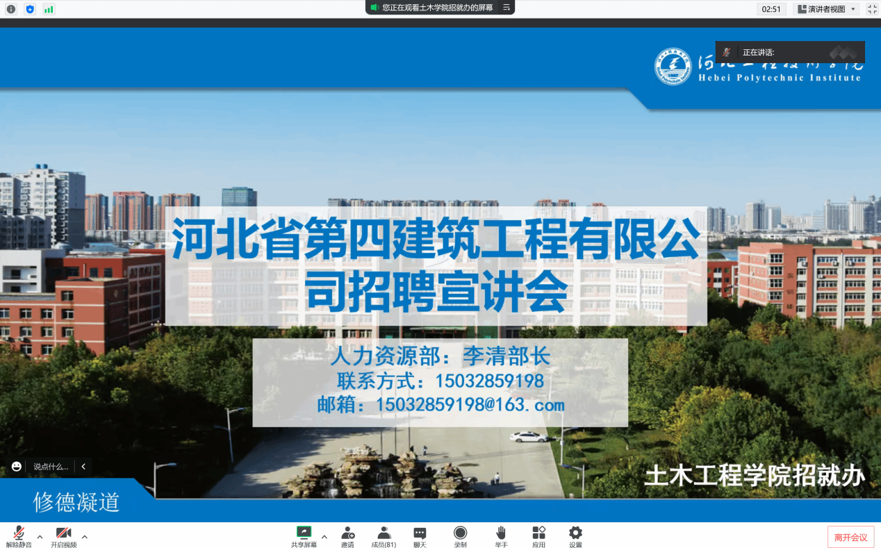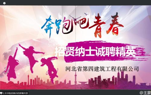 会议之初,毕业生们通过观看视频更加清楚的了解河北四建公司,视频中硕果累累的成绩更好的为我们展示了公司的雄厚实力。紧接着,李清部长通过企业荣誉、企业文化、环境、薪酬待遇、人才发展通道、岗位需求等多个方面为我们介绍了公司。此外,李部长为各位毕业生们耐心地解答问题。最后,王院长指出希望各位毕业生做好选择,积极投出简历,铆足干劲,积极开创新的未来,同时也预祝河北四建在新的一年能够取得更好的成绩,也预祝各位同学能够找到一份称心如意的工作。