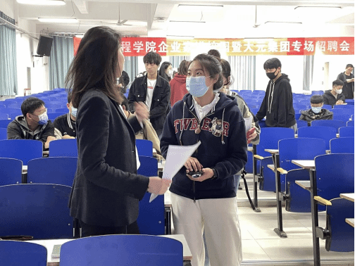 随后,大元集团董事长助理、人力资源管理中心总监苏娜做专题报告,进行校园宣讲。通过苏总监播放的宣传视频,与会人员了解了大元集团七十年来的发展历史。随后,苏总监从企业简介、业务领域、企业荣誉、人才培养、薪酬福利、招聘专业及要求等方面帮助同学更深层次了解大元集团。报告结束后,苏总监现场为各位同学答疑解惑,并用自己的亲身经历告诉同学们要坚信自己走出的每一步,绝不后悔自己的选择。最后,同学们积极投出简历。苏总监和张副总监进行现场面试,取得良好预期效果。