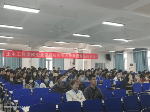 为了助力毕业生更高质量更加充分的就业,助力企业人才招聘工作,土木工程学院于2023年3月29日下午2:30在我校启行楼101举办企业家进校园暨大元集团专场招聘活动。出席本次招聘会的有大元集团董事长助理、人力资源管理中心总监苏娜,大元集团人力资源管理中心副总监张璐,土木工程学院党总支书记、副院长王蒙,2023毕业班辅导员辛静、邓霄,2024届毕业班辅导员代表以及2023届、2024届毕业生代表。土木工程学院招生就业办主任聂伶平主持此次会议。