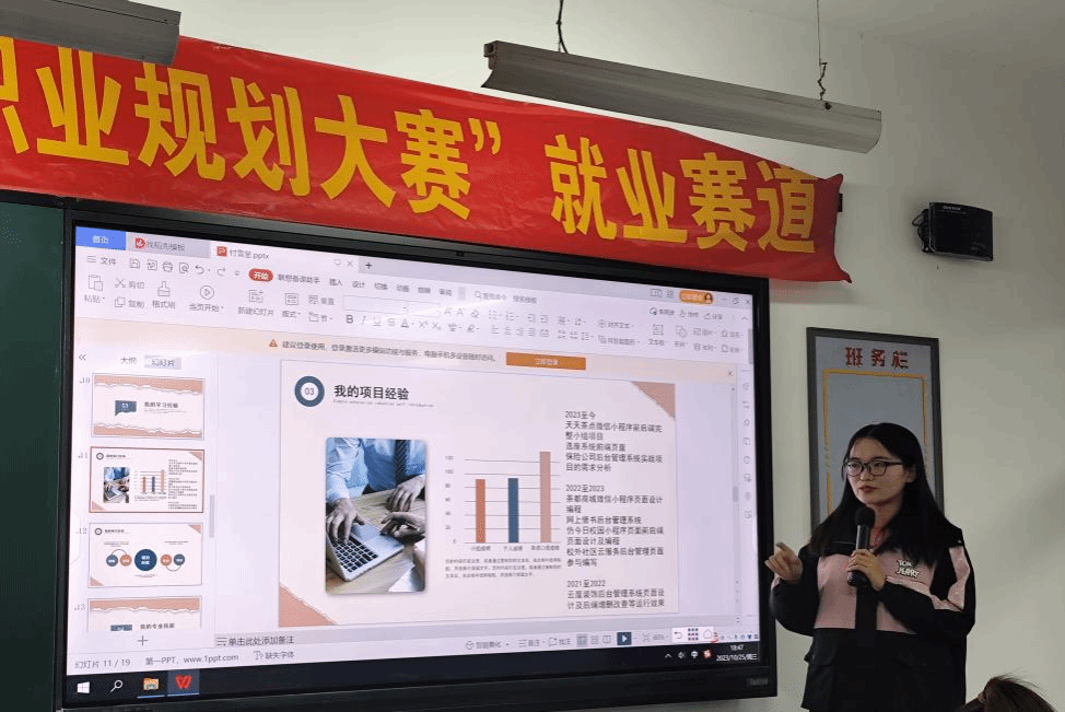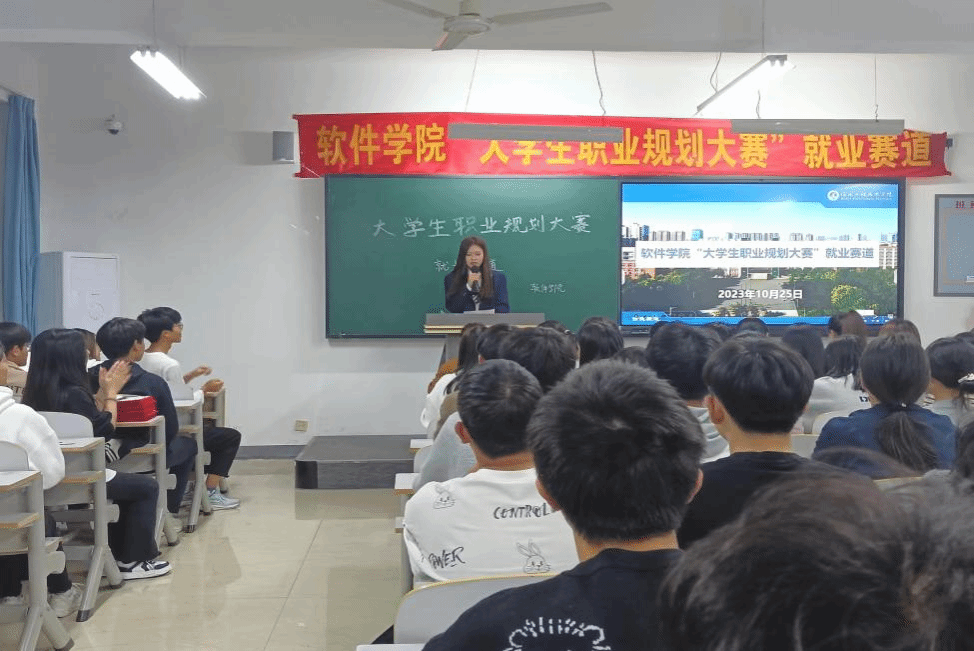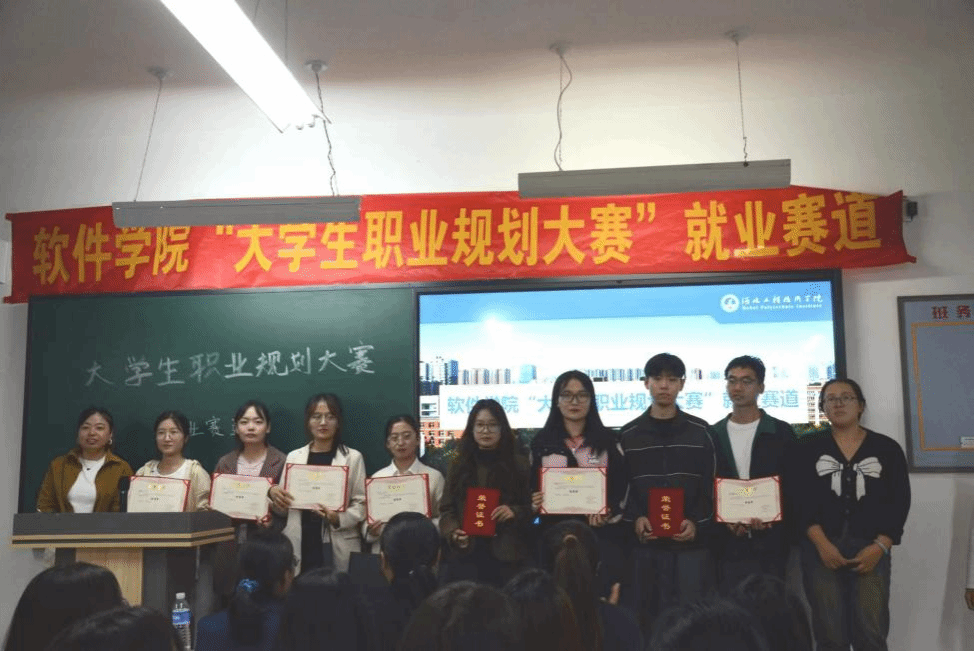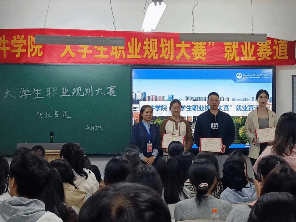 职业生涯规划可以为大学生开启一扇通往成功的门,促使大学生有计划、有目的地学习专业知识,拓展各项素质能力。为了使大学生对未来的职业走向和职业发展有更清晰的认知,对个人的实施策略有更加明确的目标,同时提高大学生的综合素质和面试能力。特此,软件学院于2023年10月25日晚上18.00在次教307举办“大学生职业规划大赛”就业赛道。本次比赛请到了教学副院长刘翠焕、电子商务系主任张丽娟、创新就业指导老师胡晓微、招生就业办主任郑曼、辅导员张跃也作为评委老师进行现场打分。