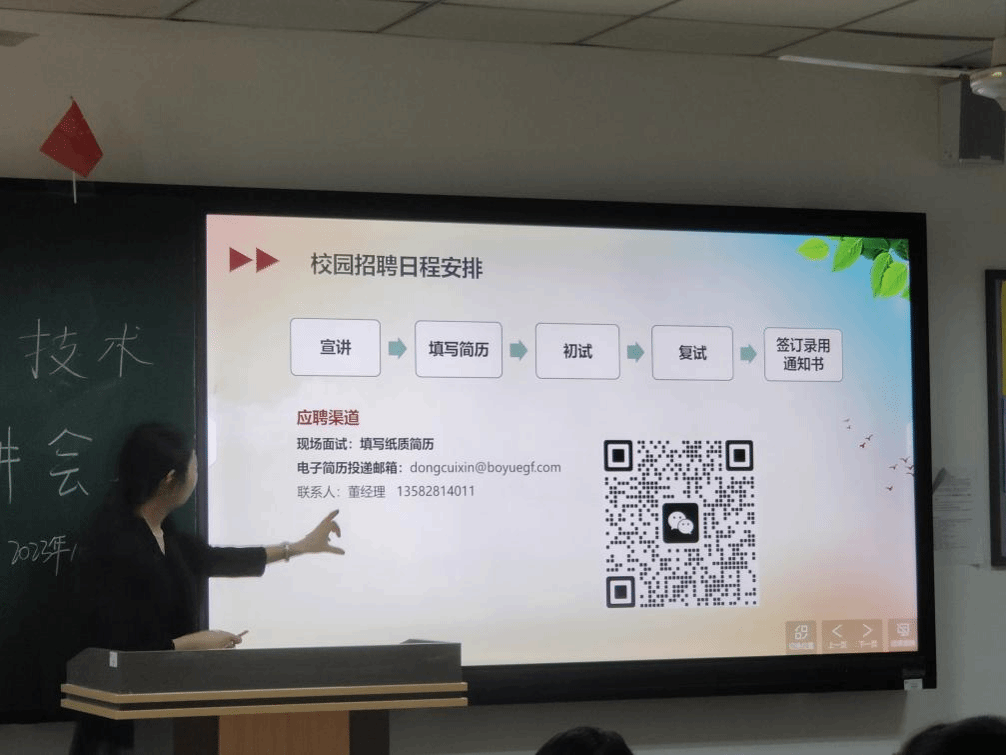 河北博岳通信技术股份有限公司人力资源部负责人首先向同学们介绍了公司的概况、发展历程和核心价值观。她强调了公司对人才的高度重视和尊重,并表示公司愿意为同学们提供良好的职业发展平台和福利待遇。接下来,向同学们介绍了公司的技术领域、产品研发和创新成果。她详细阐述了公司在通信技术领域的优势和未来发展方向,使同学们对公司的技术实力有了更深入的了解。随后,市场营销部门负责人刘经理为同学们介绍了公司的市场拓展、品牌建设和客户服务等方面的内容。她强调了市场营销在公司业绩中的重要性,并表示公司重视每一位市场人才的发挥和成长,最后企业分享了公司当下适合同学们的薪资岗位,使同学更好地根据自己的角色定位,去选择岗位。会后同学们积极扫码添加企业的公司招聘群和企业负责人的联系方式,企业负责人进行宣讲会后现场答疑,让同学更加清晰地了解企业。